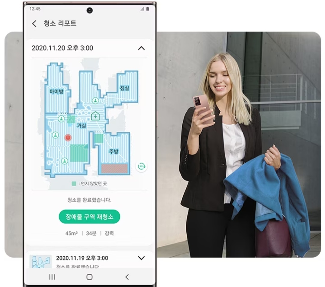 또 스마트싱스 앱을 통해서 실시간 청소 진행 상황도 확인할 수 있고, 청소리포트를 통해서 청소 히스토리를 보고 청소가 효율적으로 잘 이루어지고 있는 지를 확인할 수 있습니다.