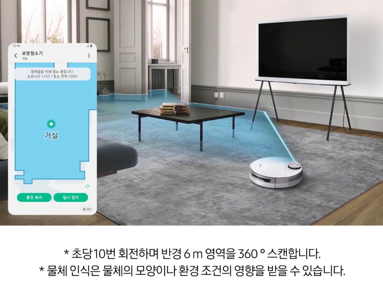 이 삼성 로봇청소기는 자율주행 자동차에 사용되는 라이다 센서를 적용해서 집 안의 구조와 크기를 정확파게 측정하고 위치를 파악한다고 합니다. 가구배치까지 정교하게 인식해서 청소경로를 최적화하기 때문에 효율적으로 이동하며 구석구석 청소할 수 있습니다.