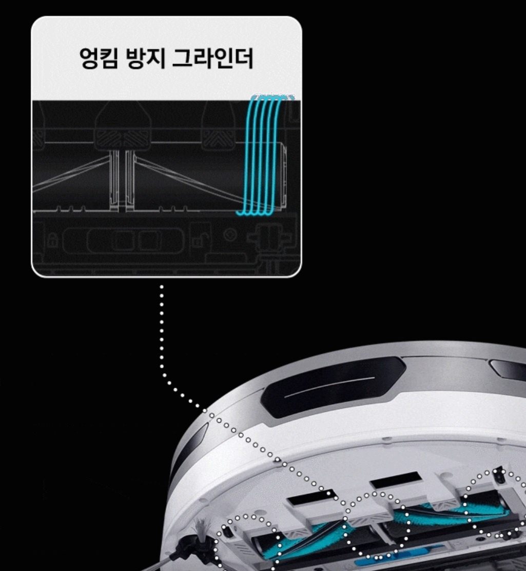 그런데 이 로봇청소기는 엉킴방지 그라인더가 있어서 브러시에 걸리는 머리카락을 잘게 잘라주기 때문에 머리카락 엉킴 때문에 브러시에 손댈 필요가 없어 깔끔하게 청소가 가능하답니다.