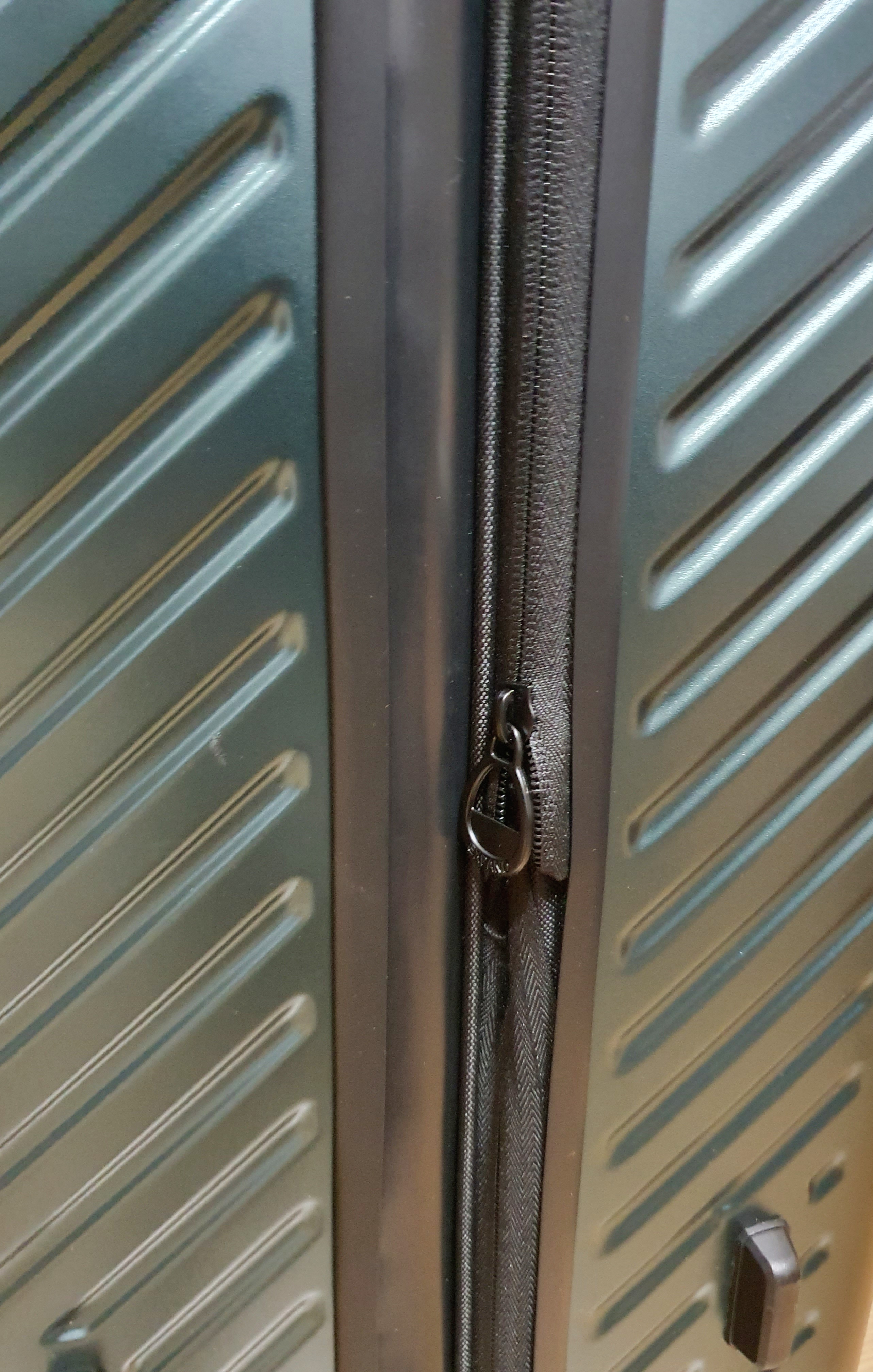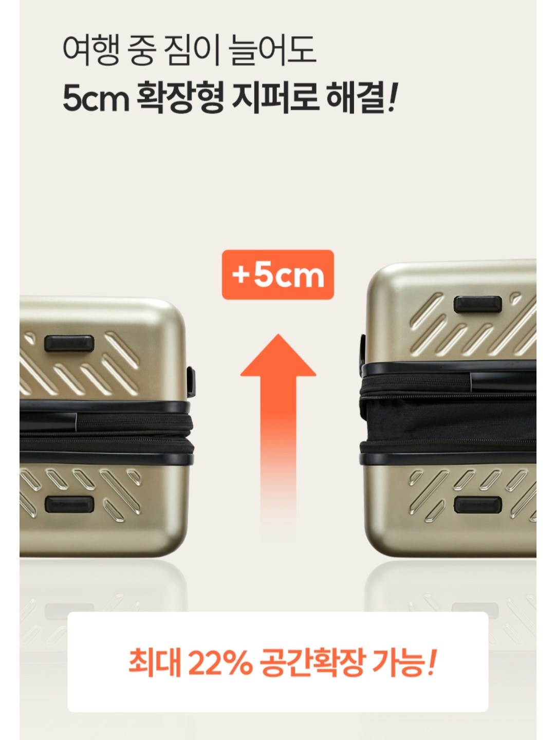 왼쪽 위에 사진에 있는 것처럼 확장형 지퍼를 열면 여행용 캐리어의 부피가 더 커져서 수납용량이 늘어날 수 있습니다.