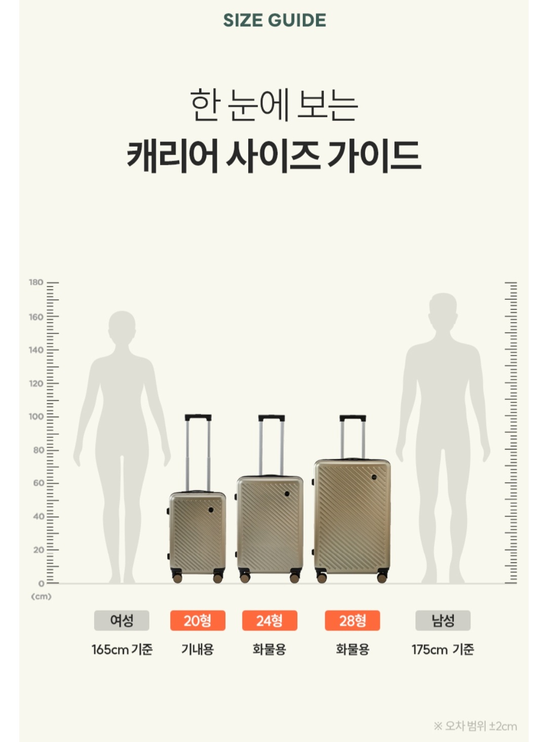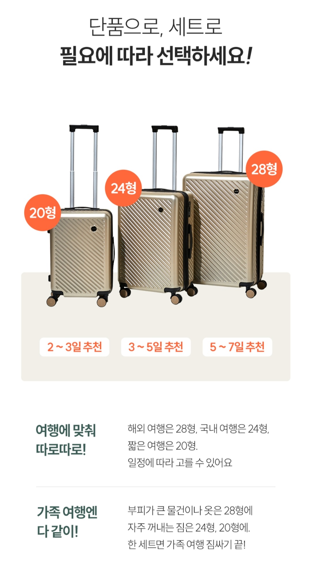 2~3일 정도의 짧은 여행은 20인치 캐리어, 3~5일 정도의 기간 혹은 국내 여행은 24인치 캐리어,