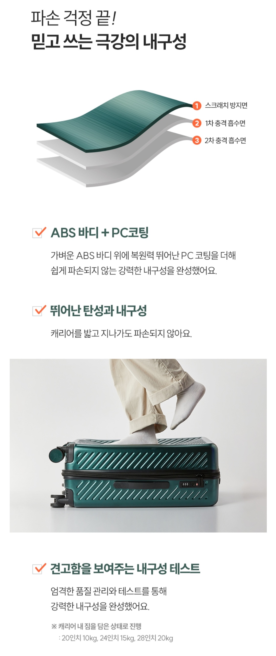 참고로 조금 더 저렴한 ABS 소재의 여행용 캐리어는 PC+ABS 소재보다는 덜 튼튼하지만