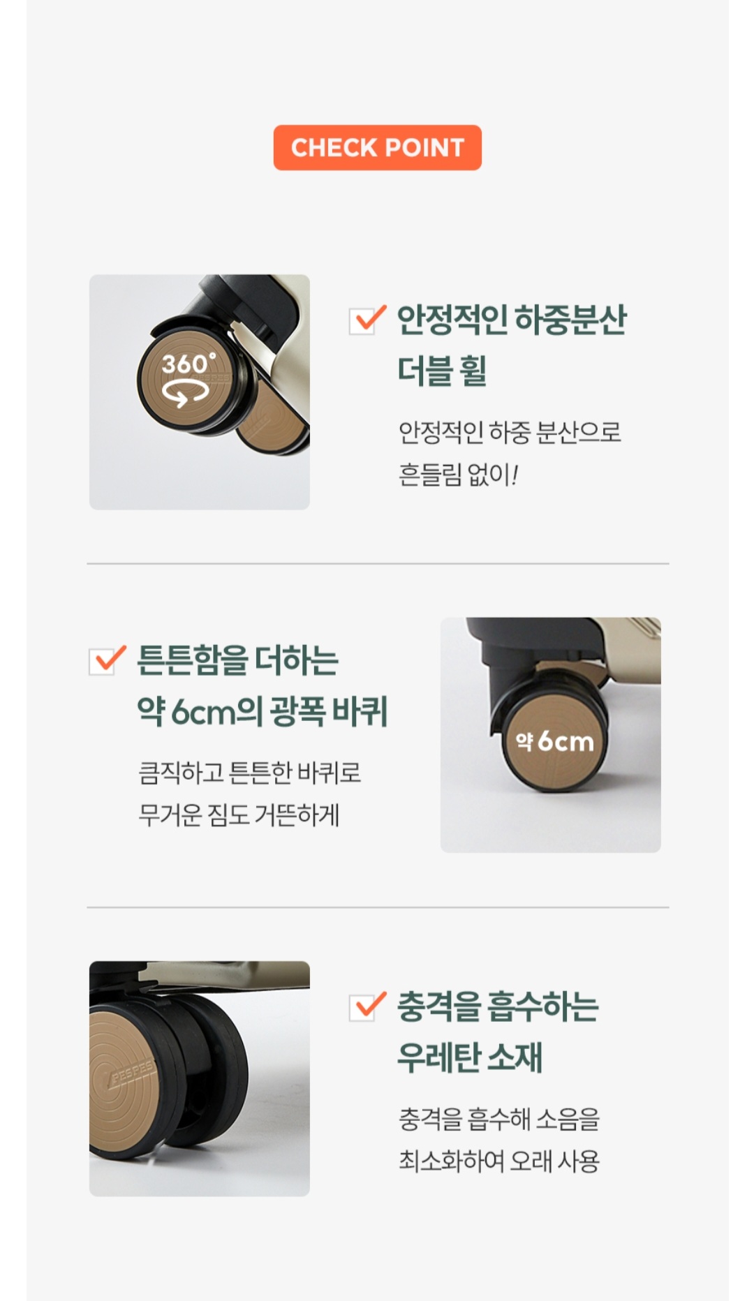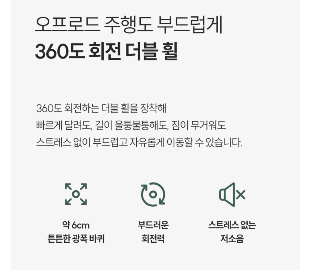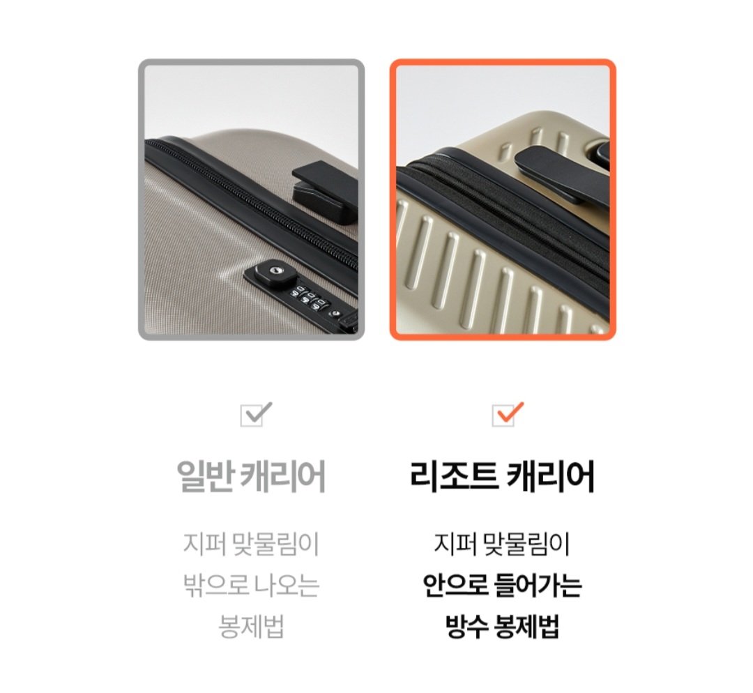 캐리어를 부드럽고 편안하게 이동하기 위해서는 이중바퀴, 우레탄 소재 바퀴인지 확인해야 합니다.