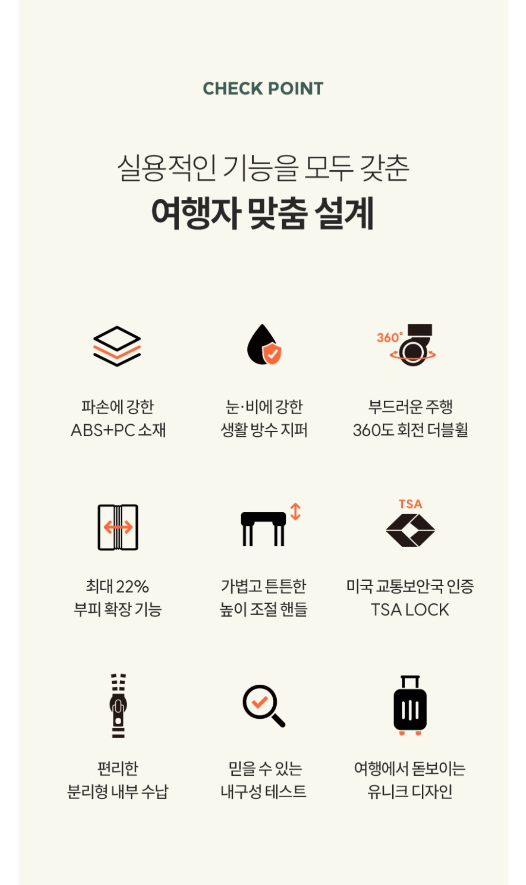 그 외에도 생활 방수가 되는 튼튼한 지퍼, 내 몸에 맞게 조절 가능한 여행용 캐리어 손잡이 등도 마음에 들었습니다.