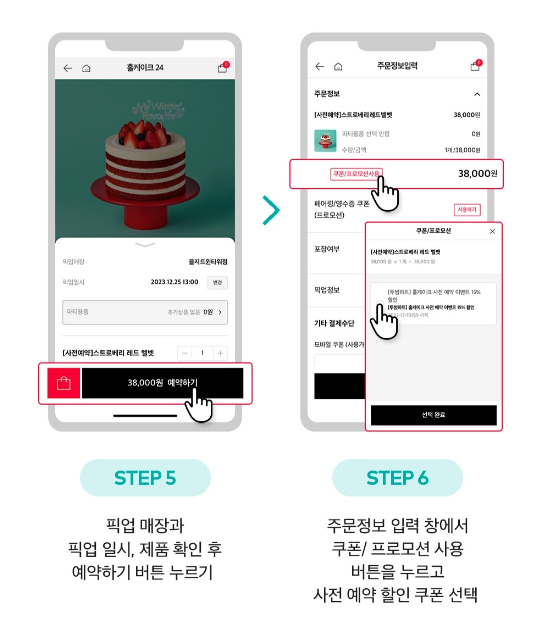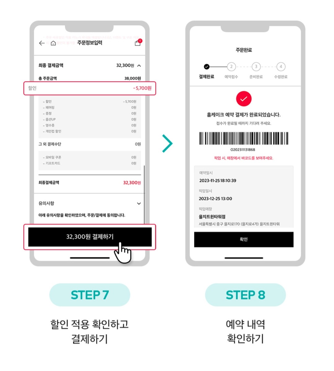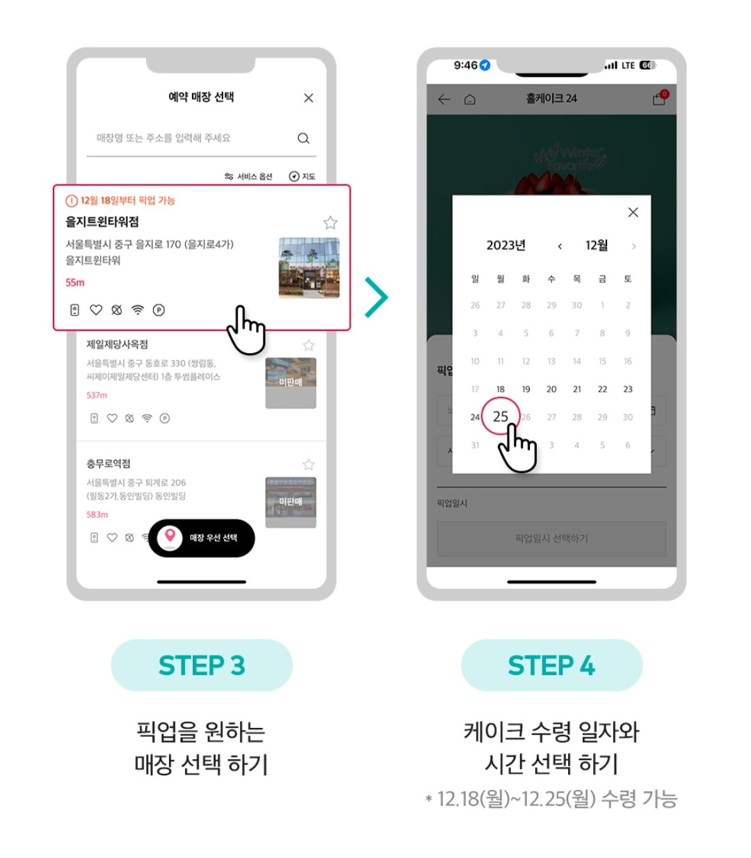 예약 후 픽업을 원하는 매장을 선택하고, 케이크 수령 일자와 시간을 선택합니다.