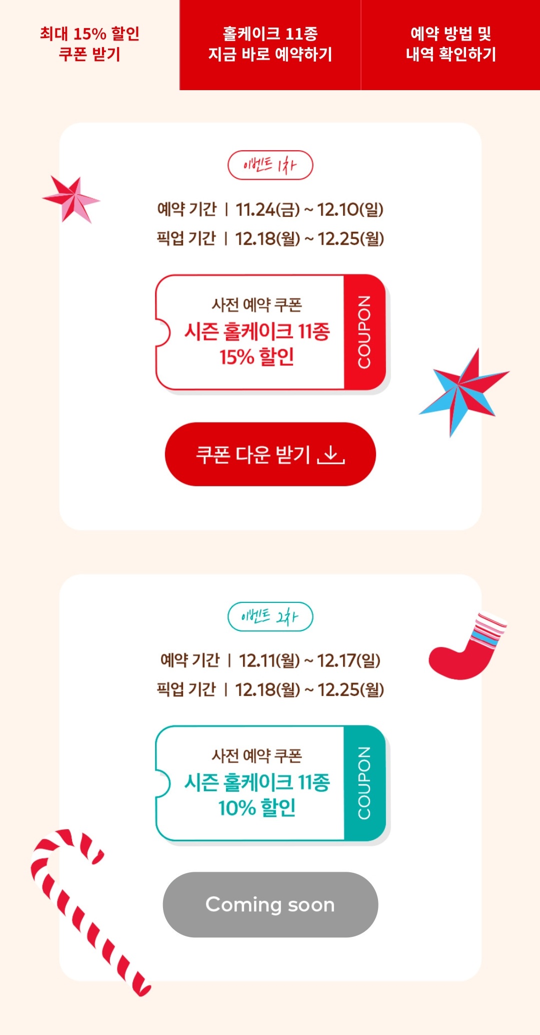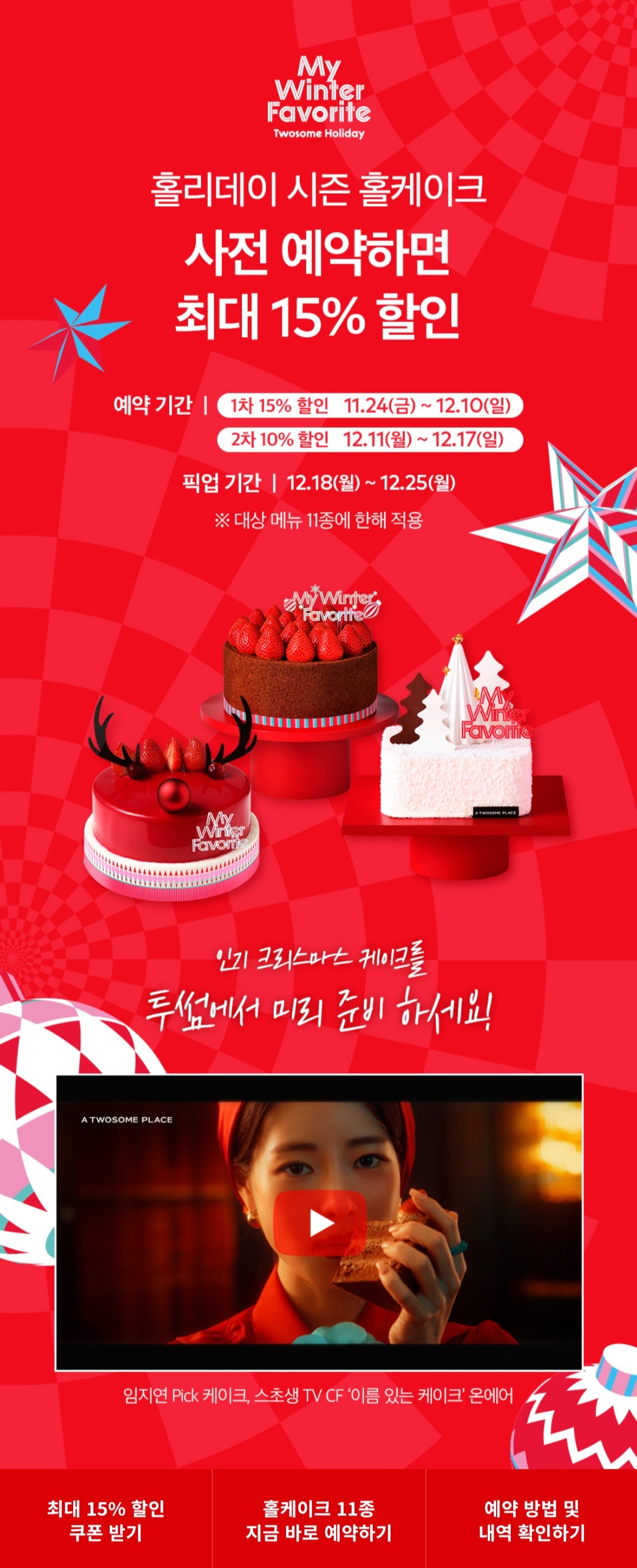 11월 24일 ~ 12월 10일 사이에 사전예약하면 시즌 홀케이크 15% 할인,