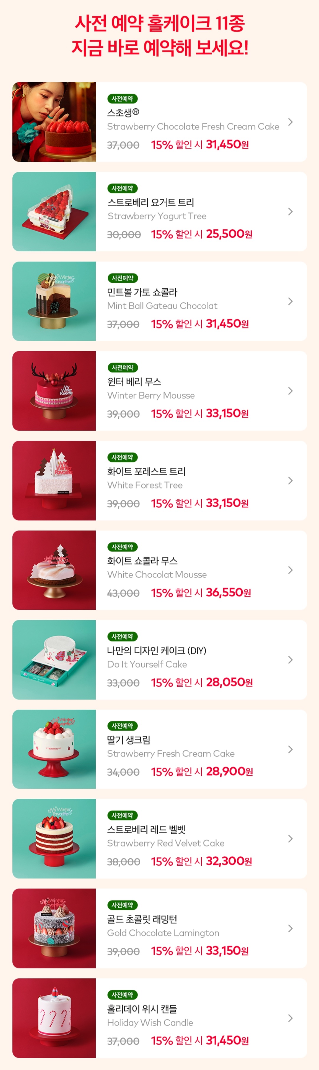 사전예약 가능한 크리스마스 홀케이크 종류는 총 11가지 입니다.